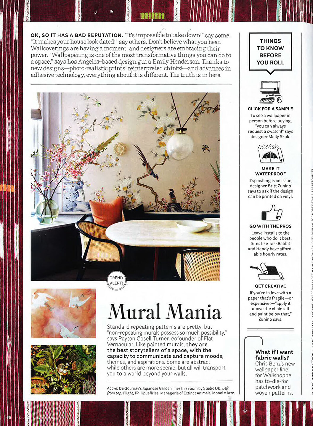 In article, "Mural Mania," Flight 7057 Sunrise on Cotton Canvas Linen is featured as the best storyteller of a space.