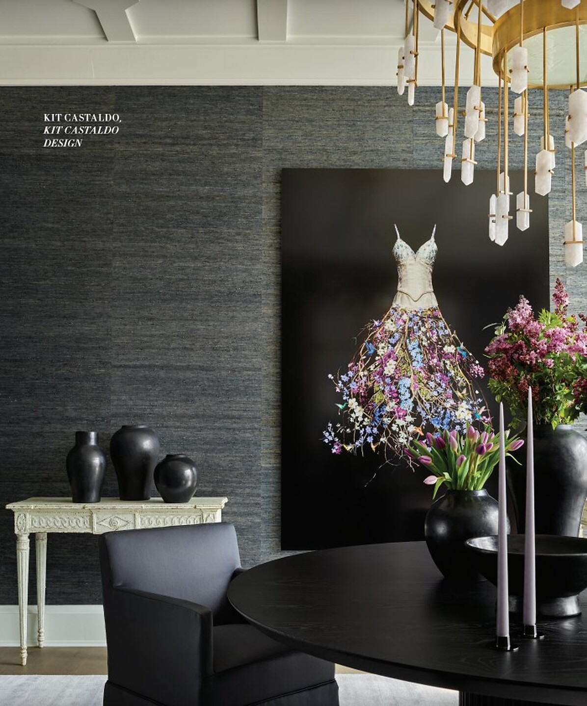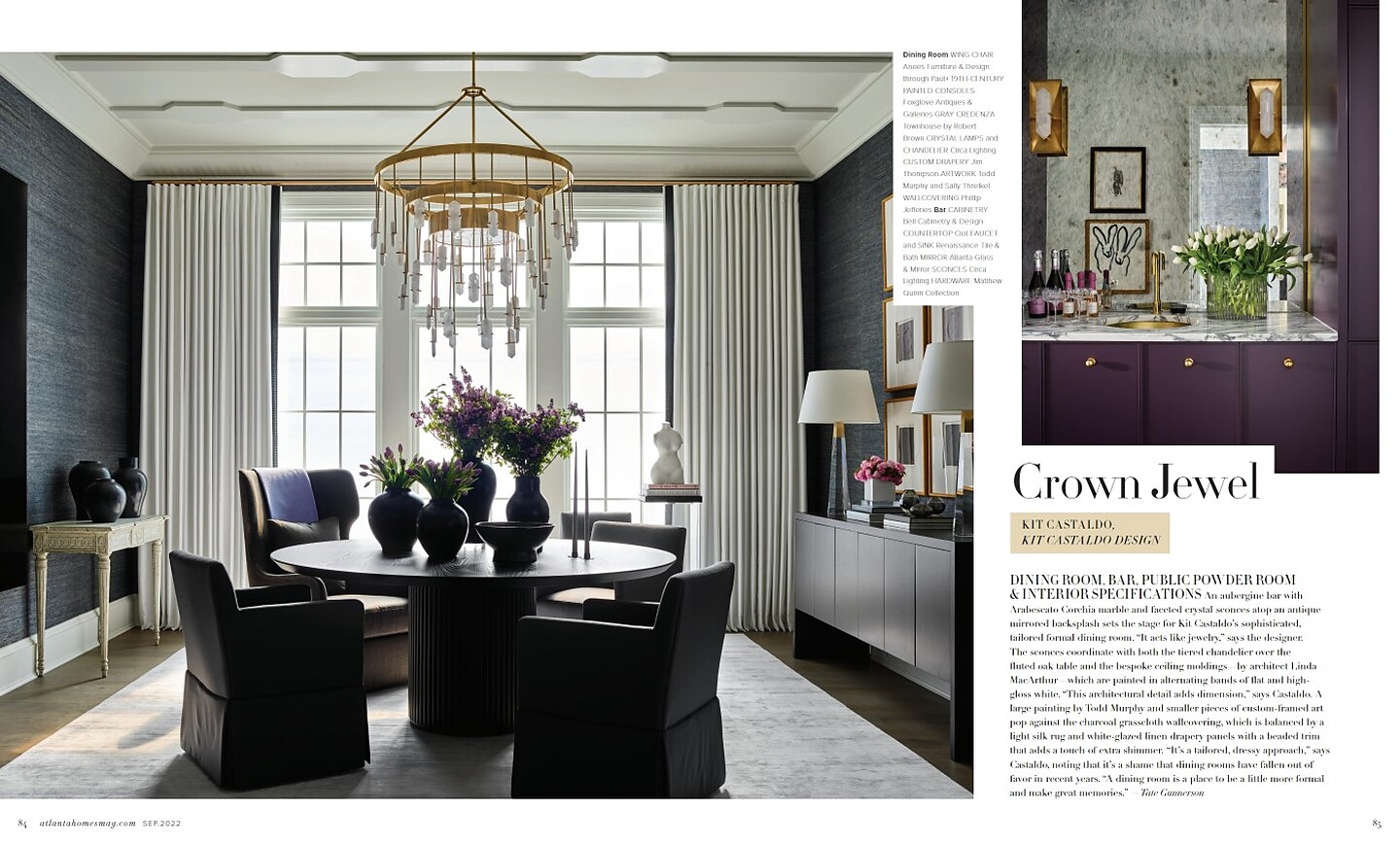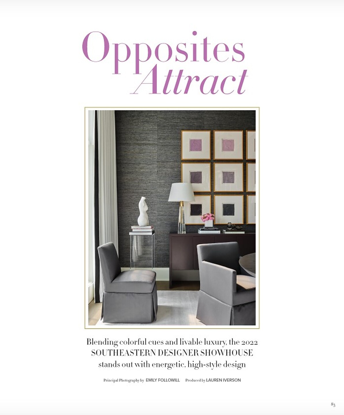 In the article "Opposites Attract" interior designer Kat Castaldo featured Extra Fine Arrowroot 3195 Gunmetal in the diningroom of the Southeastern Designer Showhouse.