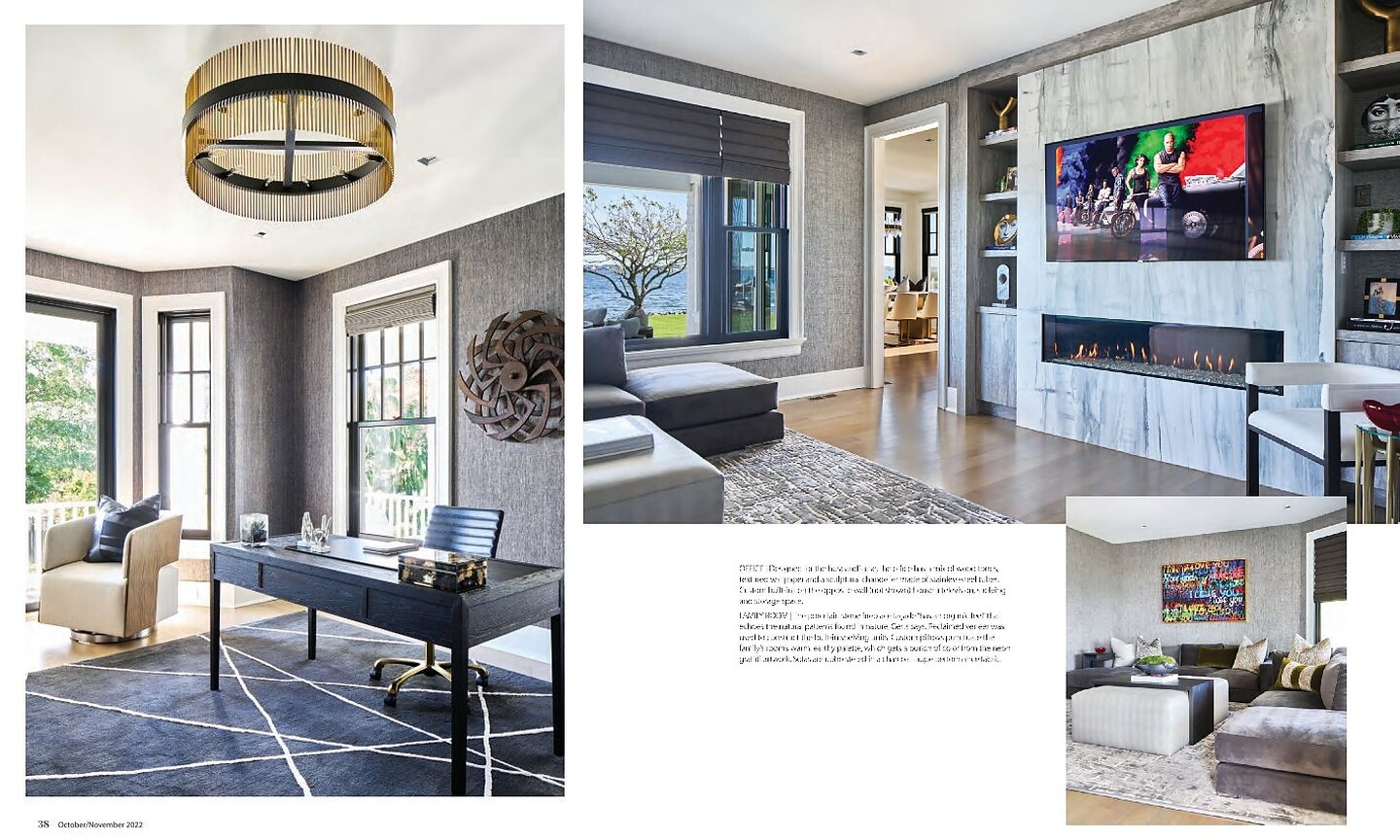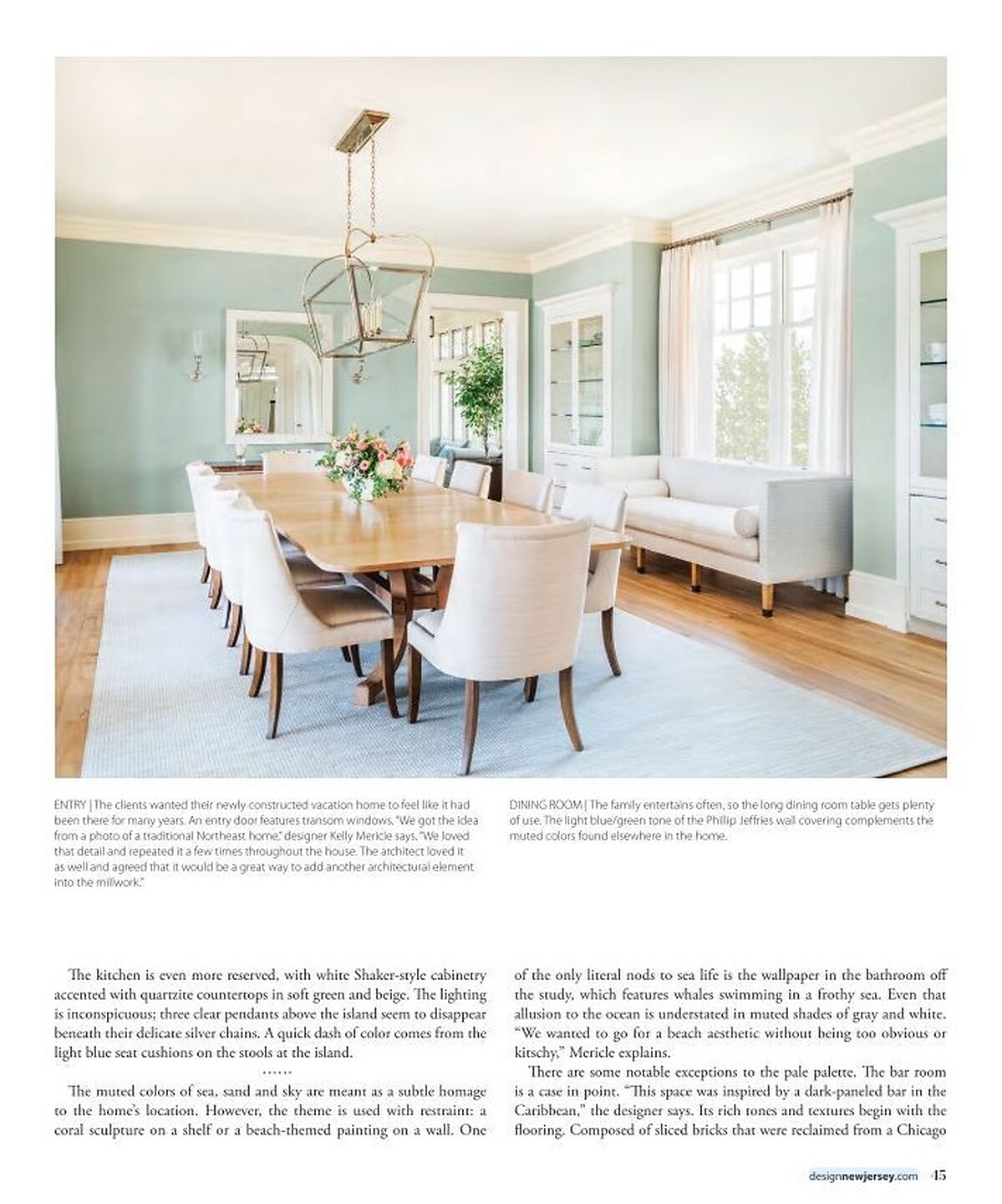 In the article "Contemporary Edge" interior designer Yelena Gerts featured Metallic Walls 3538 Cobalt in the office of a clients home.   In the article "A Sea of Tranquility" interior designer Kelly Mericle featured Eli's Epic Abaca 4985 August Green in the dining room of a clients home.