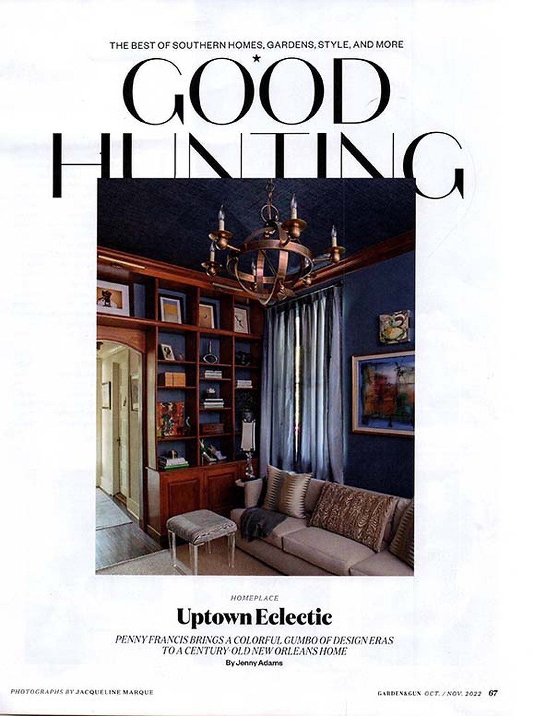 In the article "Good Hunting" interior designer Penny Francis featured Island Raffia Key 3486-B Largo Blue in the office of a clients home.