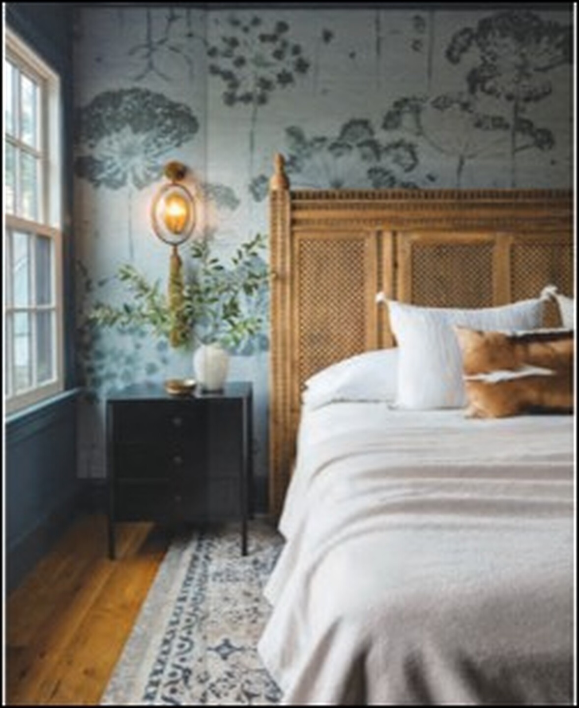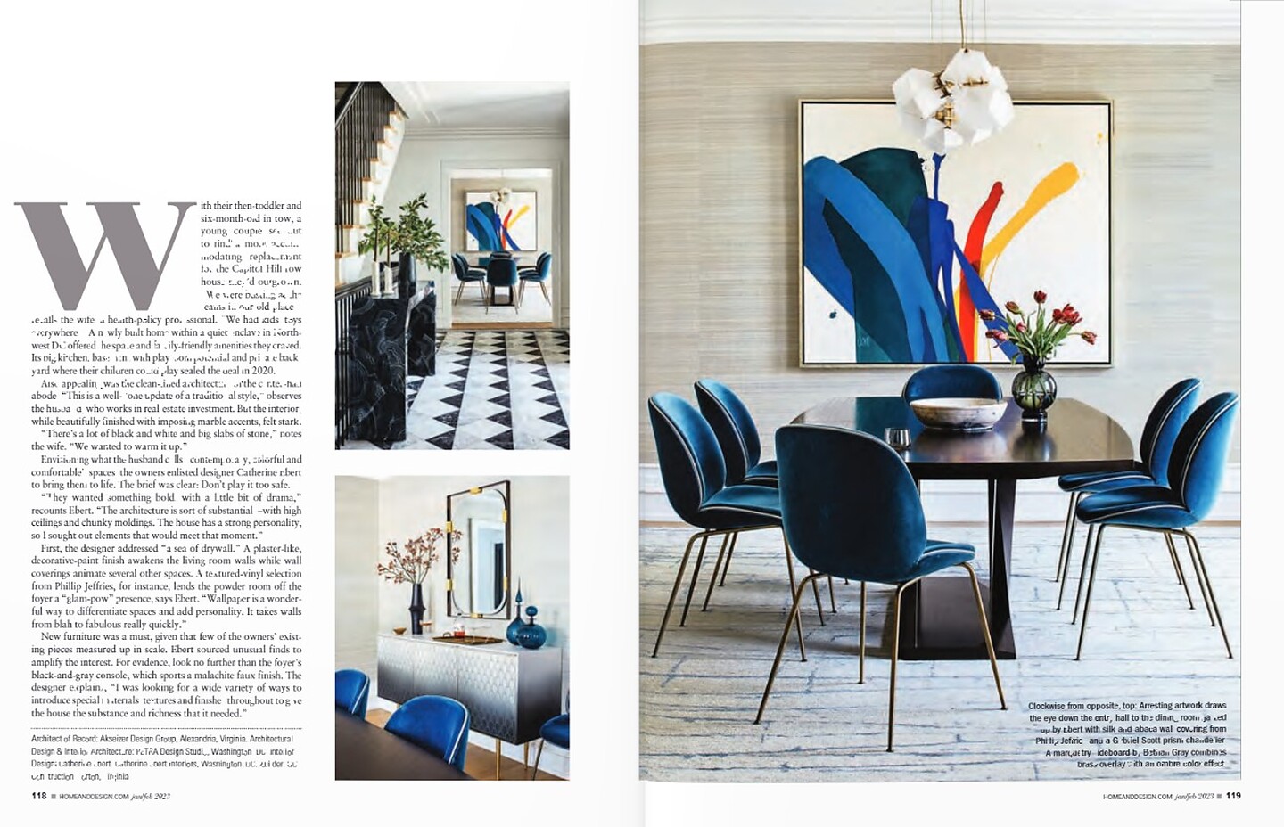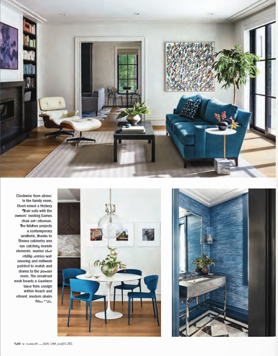 In the article "Dark Side" interior designer Ann Gottlieb featured Wish 6104 Bright Side on Spring Linen in the bedroom of a clients home.  In the article "Bold Strokes" interior designer Catherine Ebert featured Silk and Abaca 3216 Porcelain Palace in the dining room, and Vinyl Gilded Age 7455 Bell Blue in the powder room of a clients home.