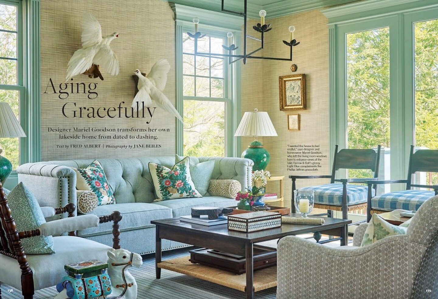 In the article, "Warm Welcome" Chauncey Boothby featured Juciy Jute 4774 Indigo Sea in the dining room of a clients home. In the article "Aging Gracefully" interior designer Mariel Goodson featured Driftwood 6203 Morning Fog in the sitting area of a clients home.