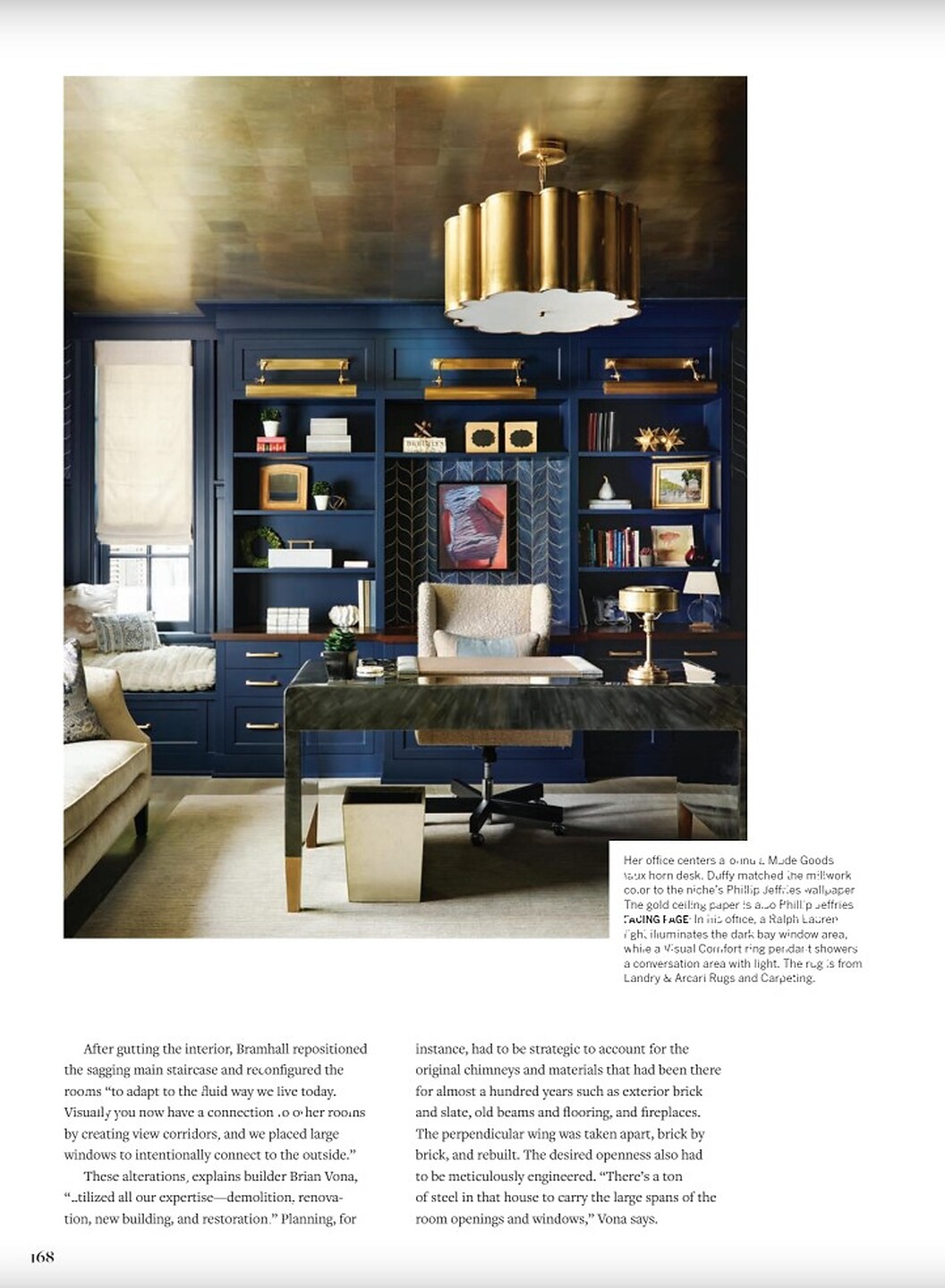 In the article, "A Study in Contrasts" interior designer Lisa Duffy featured Deco Hemp 5028 Indigo Influence in the bookshelves, and Pewter Leaf GV228 Brussels Red Squares on the ceiling of a clients office.