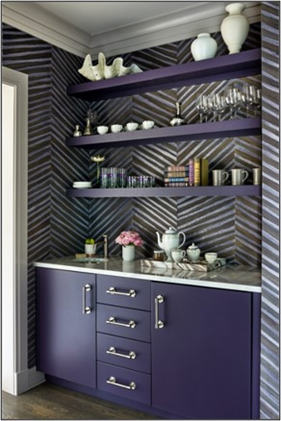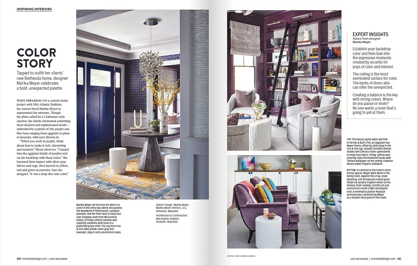 In the article "Color Story" interior designer Marika Meyer featured Woven Wood 4267 Navy Loom in the entryway, Canvas Linen 8051 Wild Petunia lining the bookshelves in an office, and ST. Barts Serenity 4214 Midnight Wind in the coffee bar area of a clients home. In the article "Shop Talk" featured Flight 7056 Deep Emerald on Pearl Vinyl Iberian Linen.
