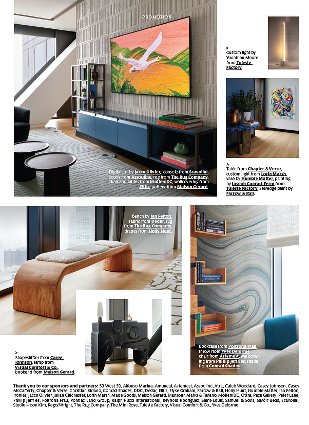 In article, "On Cloud Nine," Fox Nahem featured in the ELLE DECOR 53 West 53 penthouse, Sculpted Wood 2811 Parisian Pale in the primary bedroom, Dojo Weave 8621 Navy Plait in a bedroom, Velvet Vibes 9465 Craft Paper Tan in a bedroom, and Ripples 9265-A Bookmatched Taupe on Marshmallow Manila Hemp in the Media Room Nook.