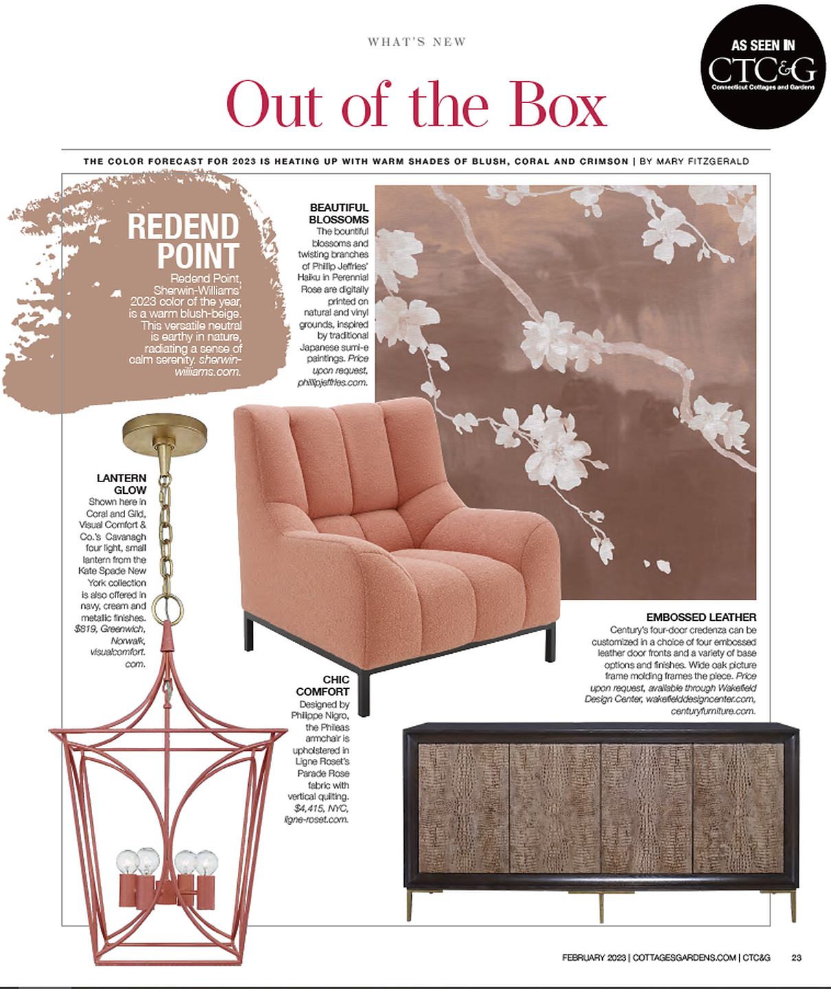 In article, "Out of the Box," Haiku 9012 Perennial Rose on Supernova White Star Dust Silk is featured among blush, coral, and crimson colored products.
