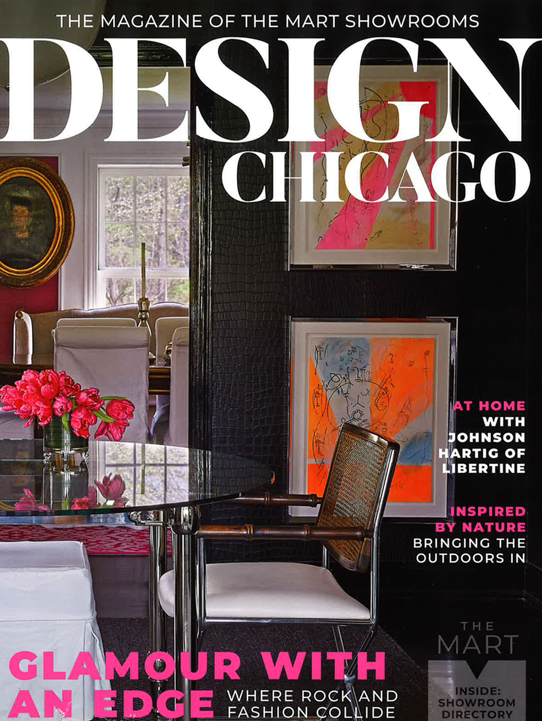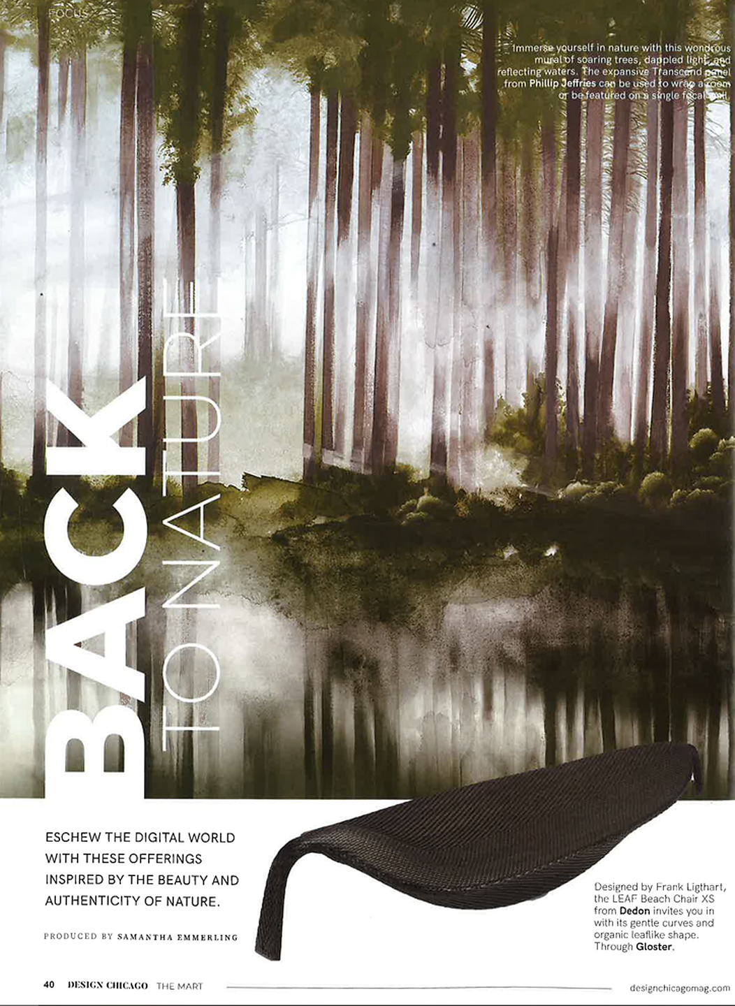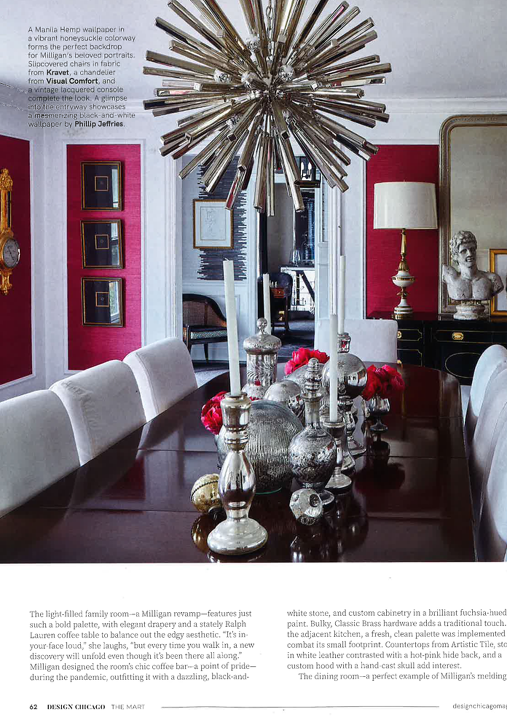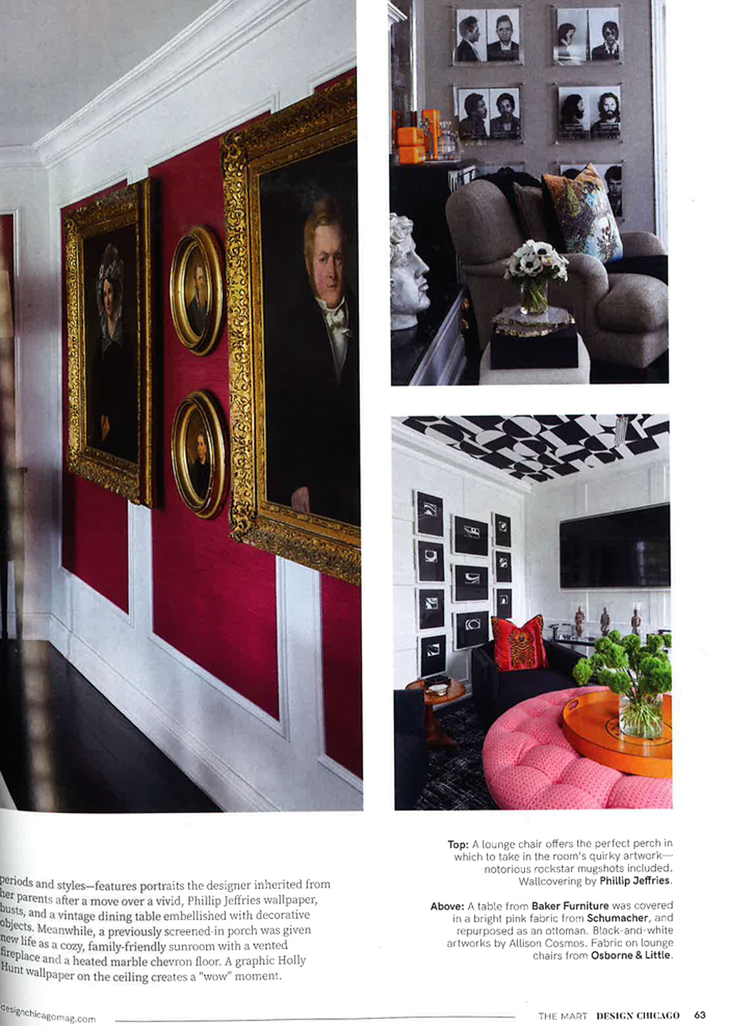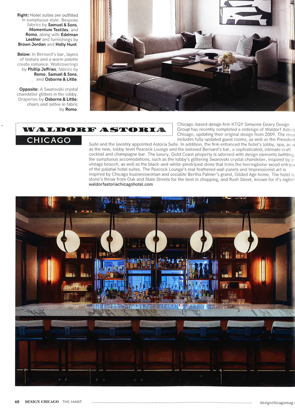 In article, "Back to Nature," Transcend 9574 is featured in a round up of nature inspired products. In article, "Rock "N" Roll Fantasy," interior designer Heather Mulligan of HM Design featured Sanctuary 4580 Awakened Silver in the foyer, Manila Hemp 5278 Fuschia in the dining room, and Tweed 5459 in the lounge of her home. In article, "Destination Style," interior designer KTGY Simeone Deary Design featured Seaside Linen 5550 Set Sail in the bar of the Waldorf Astoria Chicago. In article, "Light and Space," interior design firm Outline featured Serenity 7382 Navy on Valencia Pearl Vinyl Iberian Linen in the powder room of a client's home.