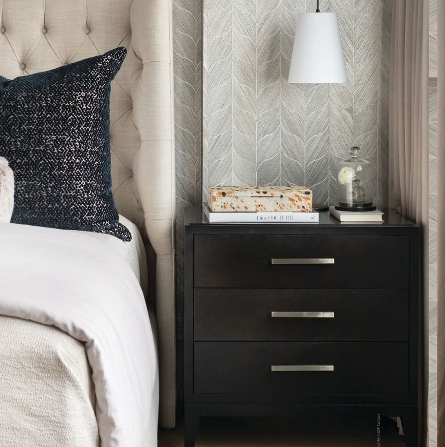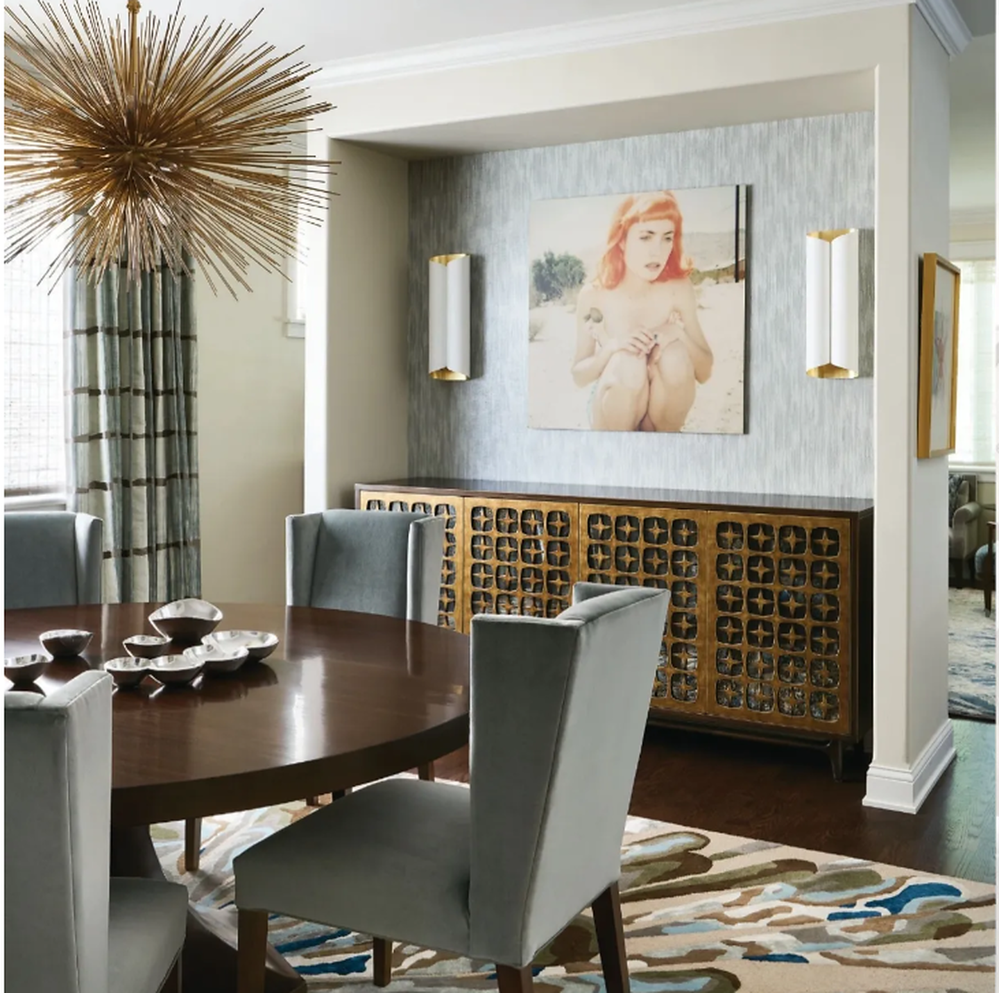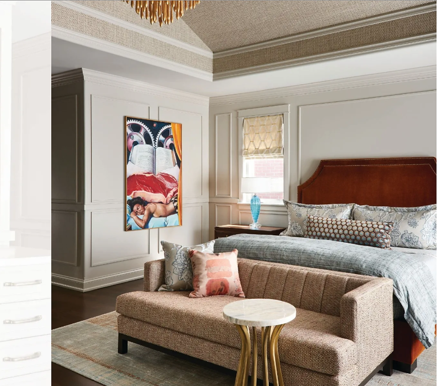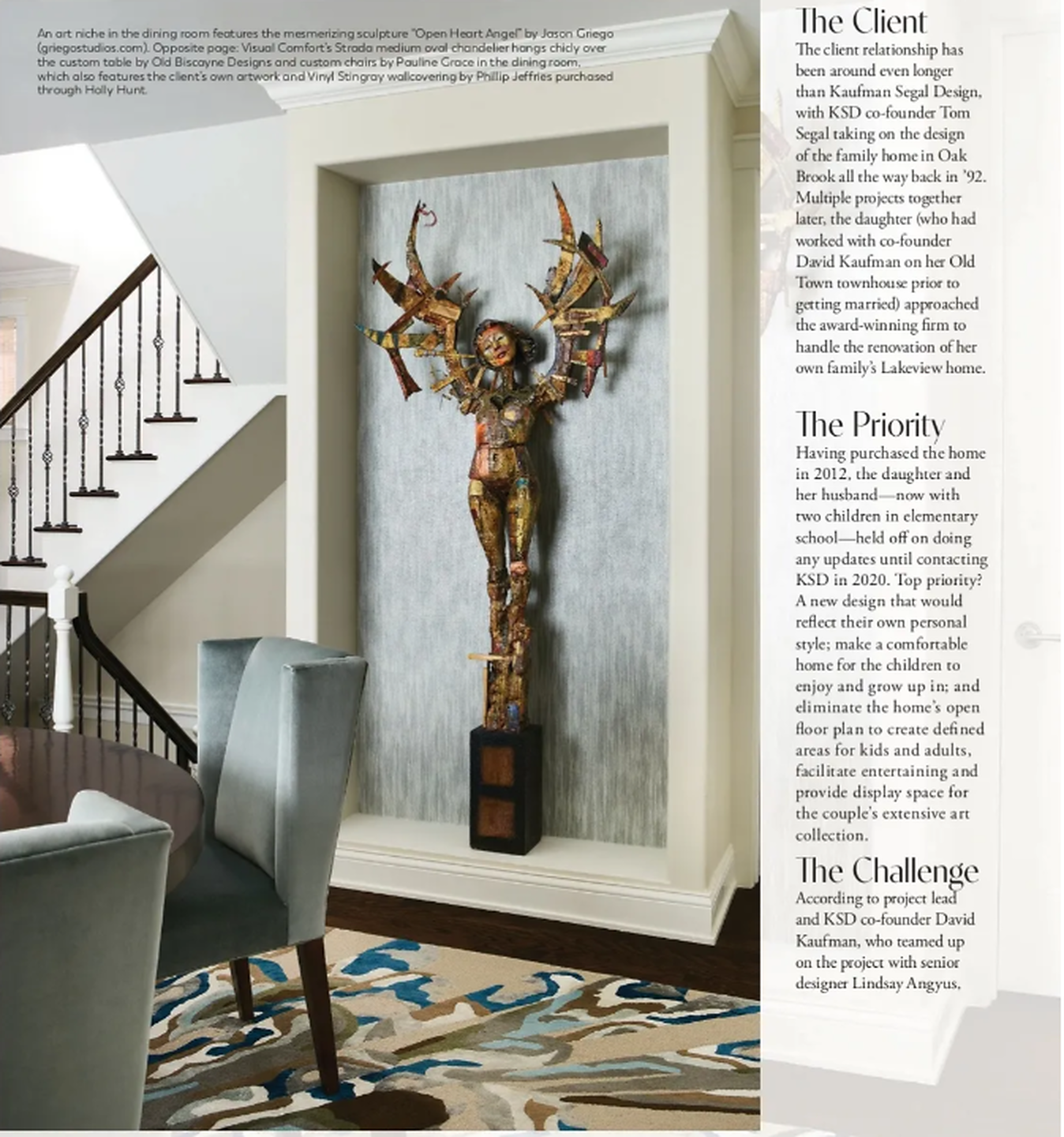 In article, "Together Again," interior design firm Kaufman Segal Design featured Vinyl Stingray 7929 Seven Seas in the dining room, Maldives Weaves 3885 Fauna on the bedroom of a ceiling, of a client's home. In article, "Lavish in Lakeview," interior designer Donna Mondi featured Deco Hemp 5022 in the bedroom of a client's home.