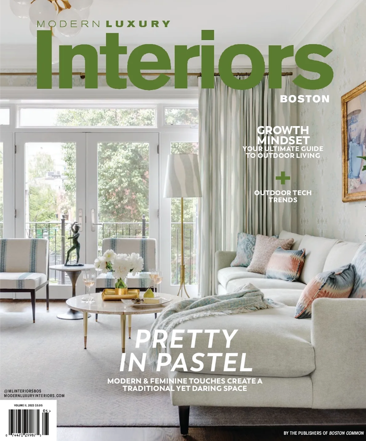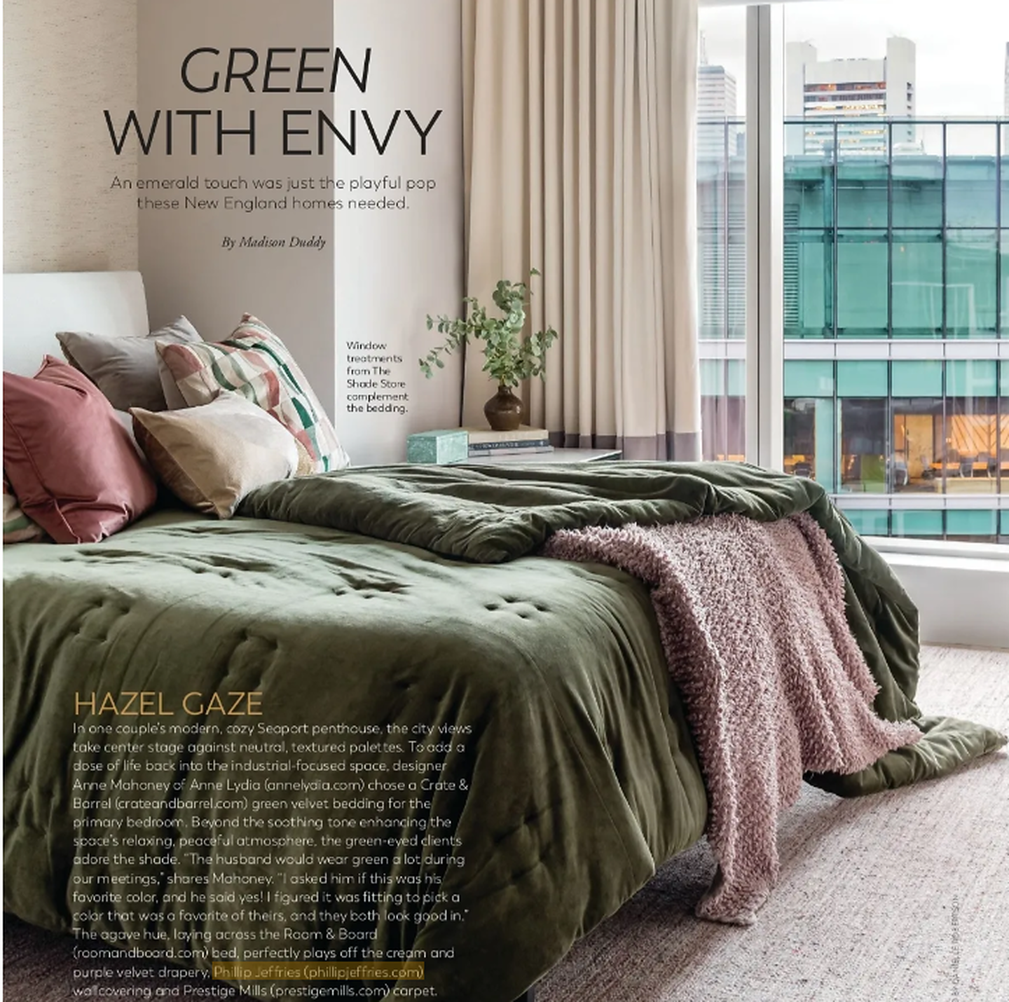In article, "Green with Envy," interior designer Anne Lydia featured Boucle Lane 2202 Cruising Cream in the bedroom of a client's home.