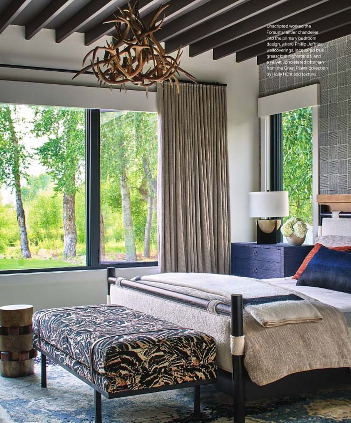 In article, "Handcrafted Americana," Unscripted Interior Design features Kantha 2584 Bodhisattva Beige in the primary bedroom of a client's country home.