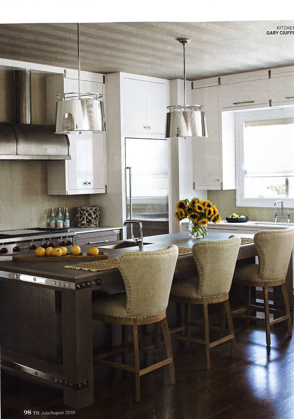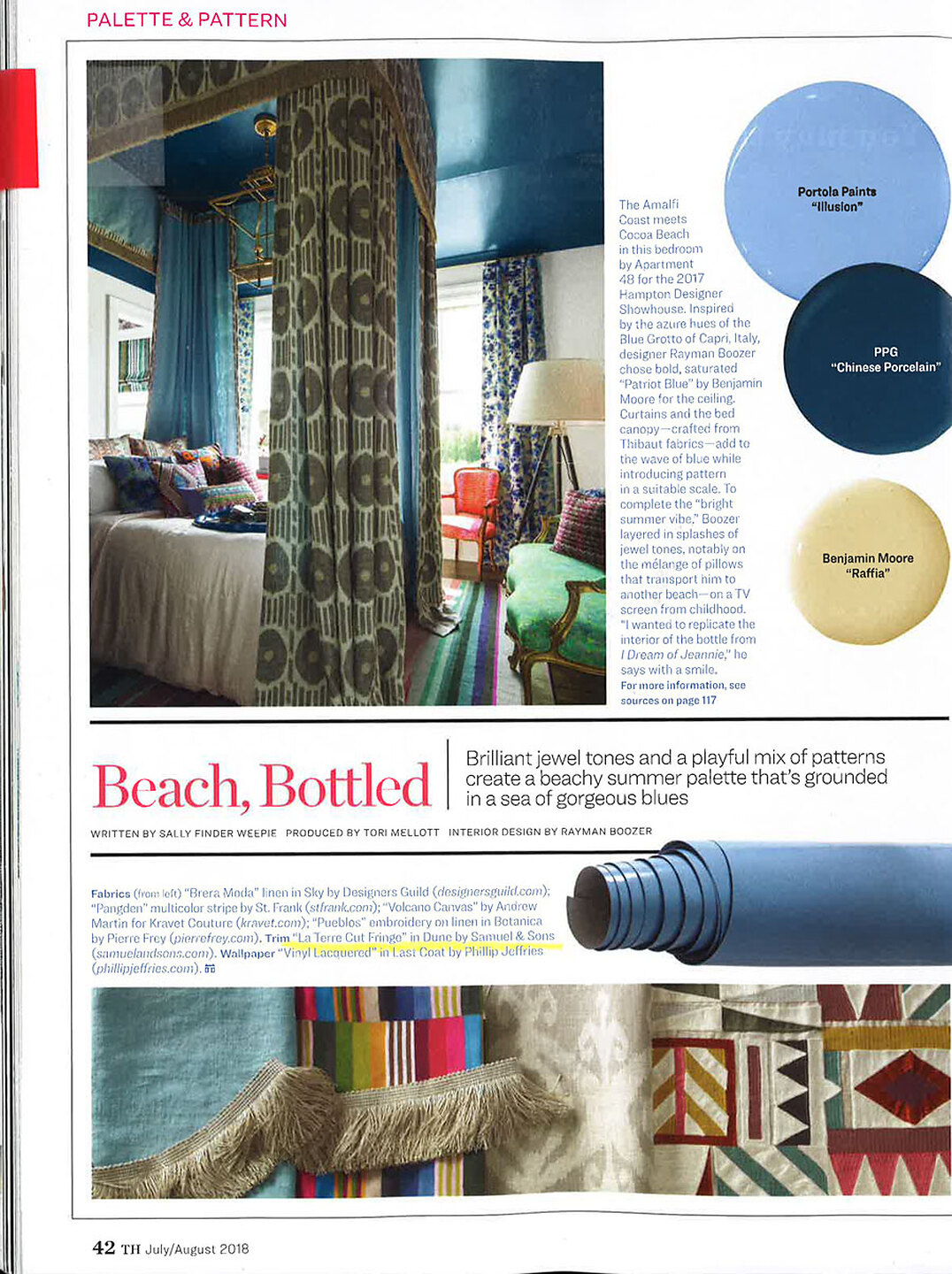 In article, "Beach, Bottled," a product shot of Vinyl Lacquered 2050 Frost is featured and in article, "Hampton Harmony," Interior designer Gary Ciuffo featured Against the Grain 4271 Taupe Timber on the ceiling in the kitchen of the 2018 Hampton Designer Showhouse.